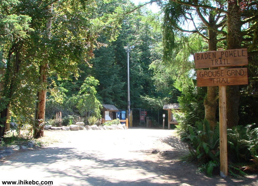 Of note: Very tough (though fairly short) trail, virtually no views, the trail is probably the most popular in British Columbia. Downhill travel is prohibited, forcing you to pay $8-10 for a gondola ride to the parking lot. Vancouver, Coast & Mountains Backroad Mapbook (2010 edition) Coordinates: Page 11 (North Vancouver) D7. Related Website: Grouse Grind Site by Grouse Mountain. Follow @ihikebc Tweet Grouse Grind is a hiking trail from the parking lot of the Grouse Mountain Recreation Area to the Recreation Area itself. A gondola runs to the top, and the hike is an alternative means of going up for those who are very fit. We did the Grind about seven years ago going downhill, and recall it being tough on the knees. Going up is not so hard on the legs as it is on your heart and your lungs, as there are virtually no flat stretches, and you are quickly gaining altitude all the time. Think of it as a natural Stairmaster. Our time was 1 hour 10 minutes, and only one hiker (a super fit lady with a bell tied to her shoe to warn barely moving or resting hikers to give way) passed us on the way to the top. We were rejoiced at our physical prowess for a few minutes, but then went into the chalet, looked at the screen listing times for top hikers, and saw that the best female in the 70-79 years category did it in 1 hour 9 minutes this year. Bummer. There were many people on the trail, despite it being a Tuesday. Many tourists and quite a few children were hiking The Grind. The weekends must be even busier. Take plenty of water, especially on a warm day. And, unless you are in a decent physical shape, consider taking a gondola to get to the top. It would be fair to say that it would take about 1 hour 30 minutes on average to get to the top, including frequent breaks to catch breath and drink water. The only unpleasant surprise happens when you get to the top and see a huge "downhill travel prohibited" sign. There are no cops waiting to ambush downhill travelers, and some people did take advantage of that. We were told by the Grouse Mountain staff that the money are needed to maintain the trail. But get this: there is NO note regarding the prohibition of the downhill travel posted at the bottom of the trail. So, once you get to the top, you are very much ambushed into shelling $8-10 for a gondola ride down. And, in what has to be one of the most innovative marketing moves of all times, the downhill gondola ride costs $10, but, if you buy a bottle of Whistler spring water in the cafe ($3 for 500 ml, or $4 for a litre), you get $5 off from the $10 gondola ticket cost. Thus, it is cheaper to buy water AND to ride the gondola down ($3+$10-$5=$8), than it is NOT to buy the water and pay $10 for the downhill gondola ticket. Also, parking costs $5 for the day. It is unclear if there is still a free dirt lot available nearby, like it was seven years ago (September 2010 Update: yes, there is - on the right side as you approach the end of the road in your vehicle). A few bus routes serve Grouse Mountain as well, including at least one tourist sightseeing bus. Photos of the parking lot A and of Grouse Mountain Recreation Area are available on the next page. September 2010 UPDATE: there is now a "Downhill Travel Prohibited" note at the Grouse Grind trailhead. Also, the water promotion has ended, and the downhill ticket is $10. Finally, gravel parking lot D is free of charge, if you can find a place there. 2014 Update: Lot D parking (dirt parking lot) now costs $2 for up to 2 hours, or $4 for the entire day. 1. The entrance to the trail is very close to the parking lot. The trail entrance would be to your right as you are driving on Capilano Road towards the parking lots, about 70 meters before parking lot A. Baden-Powell trail branches off shortly.