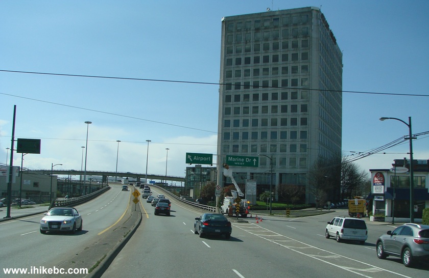 Iona Beach Regional Park is located in the town of Richmond, BC, just South of Vancouver. The main attraction of Iona Beach Regional Park is a 4 kilometre (2.5 mile) long Iona Jetty, which you can walk, jog or bike right into the Straight of Georgia, while observing numerous airplanes taking off Vancouver International Airport, or landing there. Iona Jetty path is quite similar to another Richmond attraction - West Dyke Trail - that we walked a month ago, in that it is also quite flat, offers good natural views, and allows for observation of many kinds of birds. Iona Jetty allows for a much better view of the airplanes, than West Dyke Trail, but the downside is a constant aircraft noise, which is not an issue at the West Dyke Trail. Other than the jetty, you can walk near some marshes at the Iona Beach Park, though the walking area is not very large. There are also two picnic tables near the beginning of the jetty. Check out the photos below to find out how to get to Iona Beach Regional Park from Vancouver. There are several free parking lots (100+ spaces in total) at the park. Please, note, that there is no shade in the park at all, aside from two weather shelters on the Iona Jetty. Thus, sun protection would be most helpful, especially on a hot day. Dog walking is allowed on the jetty, although leashing is required. 1. To get to Iona Beach Regional Park from Vancouver, drive South on Granville Street, or West on Marine Drive towards Vancouver International Airport. Here we are driving West on Marine Drive and following the sign to the airport.