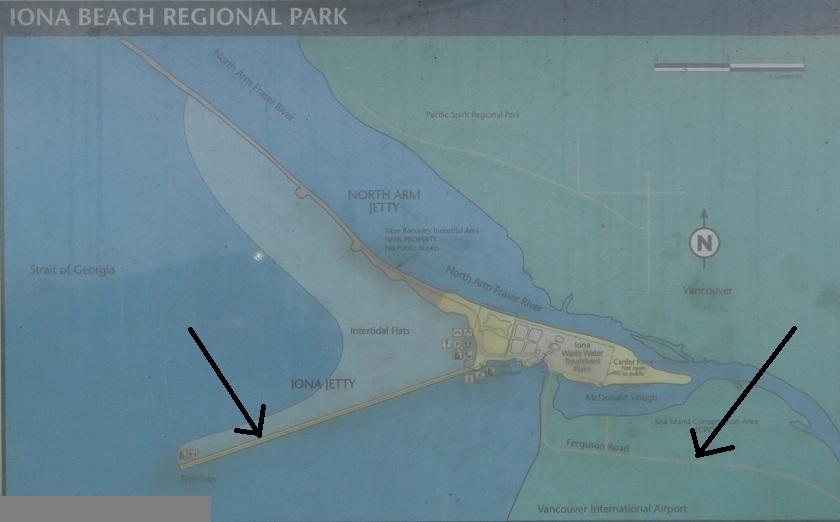 9. The information board offers many interesting facts, as well as this map. We put two arrows on the map to show Iona Jetty (on the left) and Ferguson Road (on the right) which leads to the park. North Arm Jetty you see on this map has no public access.