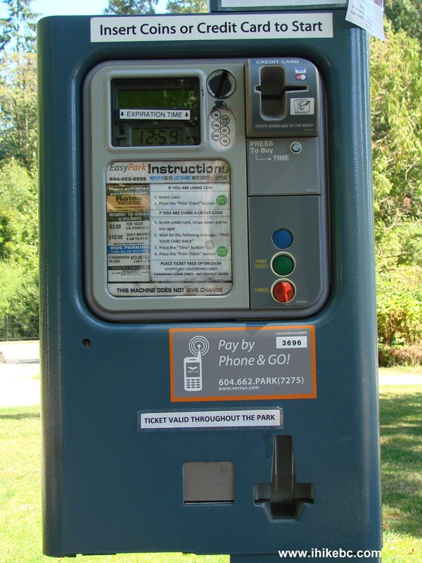 8. Here is a parking payment machine. The ticket is good throughout Stanley Park. The rate is $3 per hour, or $10 all day (6 AM to 9 PM). Between 9 PM and 6 AM it's free. The rate is lower in off-season.