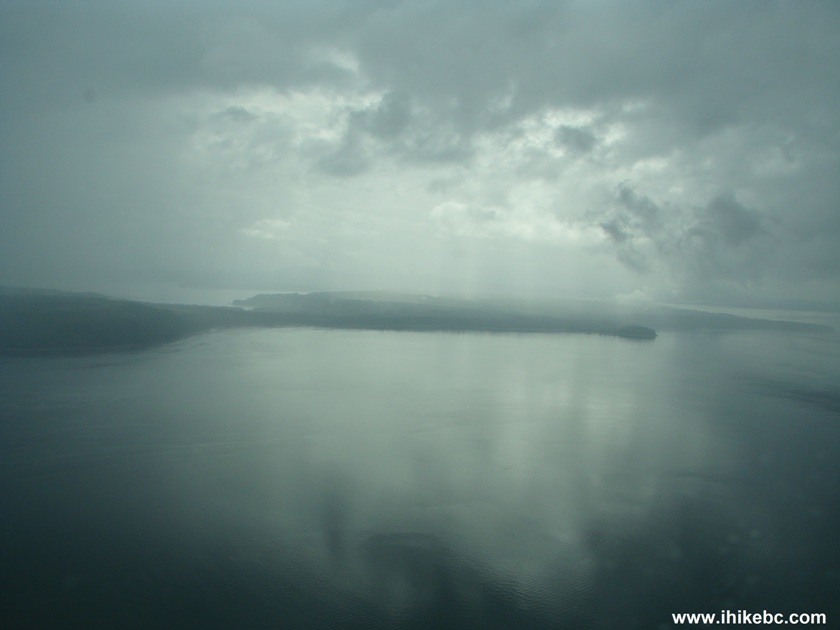 34. We definitely did not want to wait until the clouds went away, as it was anyone's guess whether the way back to Port Hardy would remain clear. So, we descended to about a thousand feet, and made a circle above a tug, which could also be seen in the photo above (white arrow pointing to it). Still, we could not see through the cloud, and were definitely not going to fly through it, as it's illegal without an instrument rating and an IFR flight plan, and, with mountains nearby, just plain wrong. So, we turned around and headed back to Port Hardy.