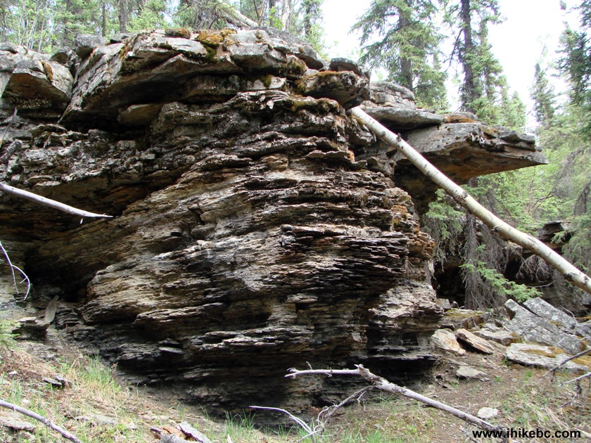Location: Northeastern British Columbia, 16th kilometer of Mile 171 (Grassy) Road off Alaska Highway (BC Highway 97), approximately midway between Fort St. John and Fort Nelson. Liked: The waterfall, layered rock by the waterfall, meeting moose on Mile 171 Road, fairly good road conditions on Mile 171 Road (but also see "of note"). June 2016 Update: Mile 171 Road is now very rutted and potholed, though still quite passable in a high-clearance 2WD vehicle. Of note: Remote area, no cell phone signal, steep cliffs at the waterfall viewing area, Mile 171 Road could be impassable in 2wd and/or low-clearance vehicles, unless it's dry. Also, there are no signs on Alaska Highway directing you to Sikanni Chief Falls, so you need to know exactly where to turn off the highway. Northern BC Backroad Mapbook (3rd edition) Waterfall Coordinates: Page 73 (Pink Mountain) B6. Related Website: Sikanni Chief Falls Protected Area - BC Parks. Related Trip: Sikanni River Trail Hike. Other Trips off Alaska Highway: Christina Falls Trail Hike, Stone's Sheep Trail Hike, Summit Ridge Trail Hike, Summit Peak Trail Hike. >>> British Columbia Waterfalls Visits. Follow @ihikebc Tweet