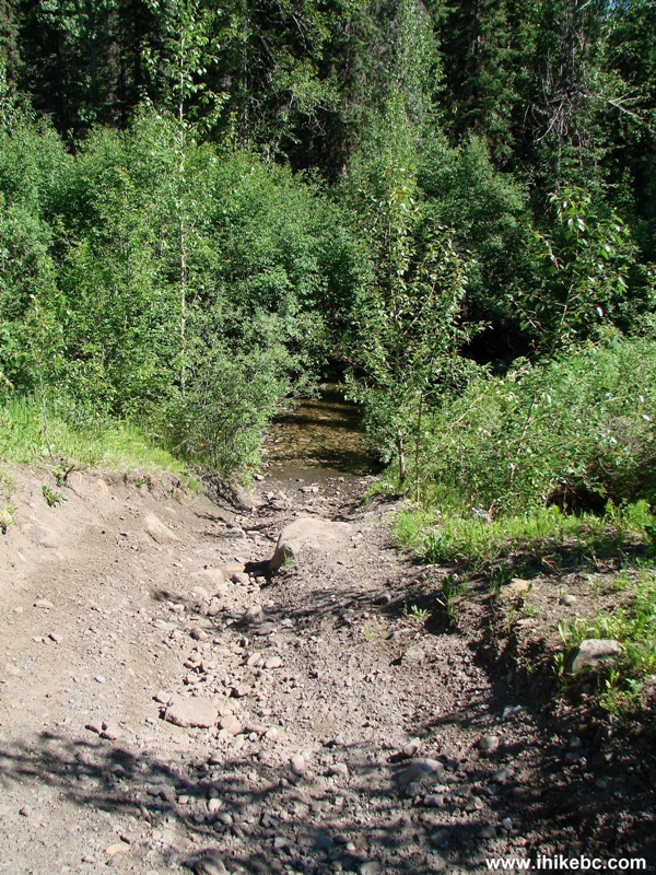15. About four kilometers later, there is a large parking area, after which the road deteriorates, and, soon, ends completely. Thus, we parked before this ditch. Coordinates: N 56⁰28.605'. W 123⁰01.394'. The good news is that, if the road surface is dry, even a low-clearance 2WD would make it at least to Christina Falls FSR turnoff seen in photo #12. The bad news is that, unless you have an ATV, you are going to fight this trail, if it's not dry. And here we are at the end of June already. Perhaps, in mid-to-late August the situation would improve for hikers?