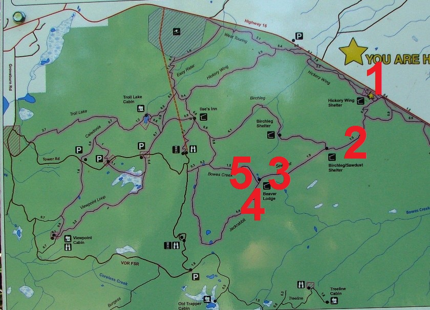 7. There is also this map there, and we have indicated with the numbers in the photo below as follows: 1 - our entrance off Highway 16; 2 - Sawdust/Birchleg Trail we took for the first 1.5 kilometers; 3 - Sawdust Trail we further took for another 1.9 kilometers after the split with Birchleg Trail; 4 - continuation of Sawdust Trail (for some reason called Jackrabbit on the map) which got very muddy, so we turned back. 5 - Bowes Creek Trail which we took for about 100 meters before losing the trail due to overgrowth and returning to Beaver Lodge to continue Sawdust Trail (which, as mentioned above, was too muddy, so we returned to the parking lot the same way we came). And the plan was to hike a loop, which is quite doable, by looking at the map. Perhaps, taking Birchleg Trail when it split with Sawdust would have accomplished that objective, but that remains to be seen.