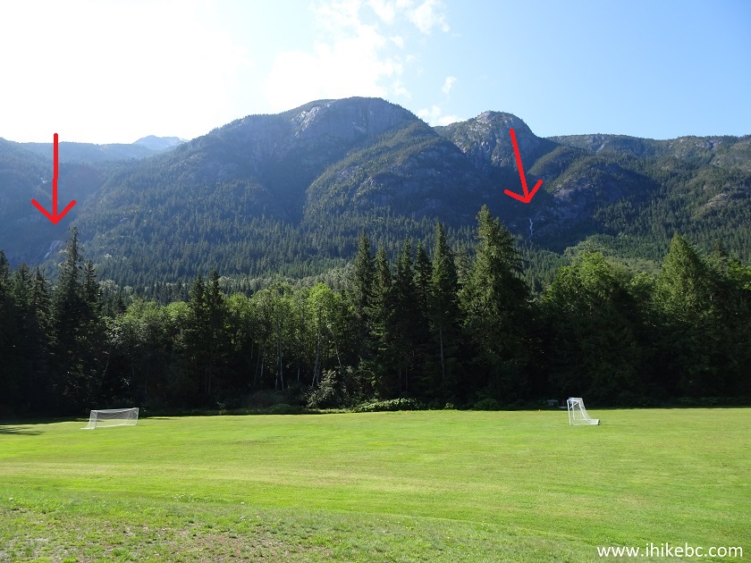 4. Heading towards the trailhead. There is a sports field behind the schools, and the trailhead is located across the field seen below. From this spot, you can also observe both the East waterfall (to the left) and the West waterfall, the subject of this trip report.