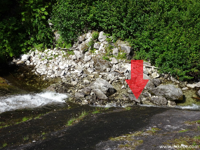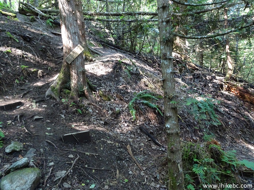 6. The trailhead for both waterfall trails. Coordinates: N 52⁰23.231' W 126⁰32.348'. Elevation: 52 meters. Other than two signs on Highway 20 (one for each direction of travel) with a lone silhouette of a hiker and an arrow pointing where to turn onto the school grounds, nothing indicates that there is a trail here, until you get to the trailhead.