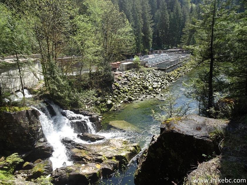 64. Looking downstream, a small waterfall and a hatchery in the background.