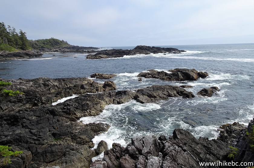Of Note: Tsunami hazard zone. Rock-hopping on Rocky Bluffs (beyond the end of the trail) is for experienced, well-equipped hikers only. The trail is very popular.Vancouver Island Backroad Mapbook (9th edition) Trailhead Coordinates: Page 6 (Ucluelet) B2. Related Websites: Wild Pacific Trail - Official Website, Wiki - Ucluelet, Google Maps - Ucluelet. Follow @ihikebc Tweet Wild Pacific Trail is quite easy, with only a few small hills, and features numerous fine views of the rugged coastline of Western Vancouver Island. This trail is located by BC Highway 4, near the town of Ucluelet. Highway 4 starts near the East coast of the Island, goes through Port Alberni, and then, at Pacific Rim Visitor Centre, makes a right turn towards Tofino. At that same intersection / T-junction, a left turn leads to Ucluelet (pronounced You-CLUE-Let) in 8 kilometers, where the Lighthouse Loop of Wild Pacific Trail is located. A longer trail (also called Wild Pacific Trail), which is not connected to the Lighthouse Loop, goes from Ancient Cedars Loop (5.5 km from Pacific Rim Visitor Centre) to Brown's Beach / Big Beach (Western end) and Rocky Bluffs (Eastern end). On July 13th, we started at Ancient Cedars Loop and hiked to Rocky Bluffs (eastern end of the trail) 1.2 km later. There is no parking or any further progress available at that end, so you need to double back. On August 31st, we returned to hike the remaining 2.8 km to the western end of this part of Wild Pacific Trail (to Brown's Beach / Big Beach). If you start at Big Beach or Brown's Beach parking lots, it's 4-5 km one way to Rocky Bluffs past Ancient Cedars Loop (you can bypass it, as there isn't much to see on that short trail, as it's a connector to the highway). Also on August 31st we also hiked the Lighthouse Loop of Wild Pacific Trail, located even further West than Brown's Beach / Big Beach. It's actually a stand-alone trail separated from the Rocky Bluffs - Brown's Beach/Big Beach Trail by several kilometers of Ucluelet town streets, but it's also called Wild Pacific Trail, so we included the Lighthouse Loop into Wild Pacific Trail trip report on Page 3. On July 13th, after hiking to Rocky Bluffs (eastern end) we planned on heading West from Ancient Cedars Loop towards Brown's Beach/Big Beach, and actually hiked for over a kilometer in that direction, but mist rolled in from the ocean, making the views rather unappealing. Considering the dark-coloured, gloomy rocks of the Vancouver Island coastline in this area, sunshine makes the views so much better. Do note that going West (towards Brown's Beach / Big Beach) from Ancient Cedars Loop is a but more challenging that going East (towards Rocky Bluffs), though not by much, and there are "Artists' Loops" (so called because there is an occasional small piece of art installed there) spurs through slightly more complicated parts of the trail, which lead to very fine views. Those with strollers or otherwise wishing to have an easier hike have an option to bypass the loops (and the views). To summarize: Page 1 (this page) of Wild Pacific Trail trip report covers Ancient Cedars Loop Trail to Rocky Bluffs (Eastern end of the trail). Page 2 - Ancient Cedars Loop Trail to Brown's Beach/Big Beach (Western end of the trail). Page 3 - Lighthouse Loop Trail even further West (it's technically a separate trail, but is also called Wild Pacific Trail, so we included it in this trip report). 1. We are on Vancouver Island, Westbound on BC Highway 4, with Port Alberni, Ucluelet and Tofino straight ahead.