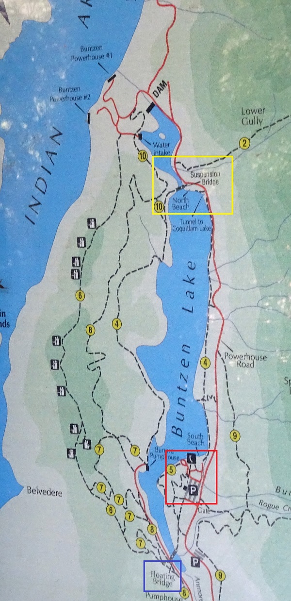 4. And here is a trail map, posted on the information board. We have indicated as follows: red square - South beach and the trailhead; yellow square - North beach and the suspension bridge; blue square - floating bridge. Buntzen Lake Trail is marked #4 on the map. Of note is trail #6, which is a very picturesque (but much tougher) Diez Vistas Trail on the West side of Buntzen Lake. Diez Vistas Trail starts and ends off Buntzen Lake West trail.
