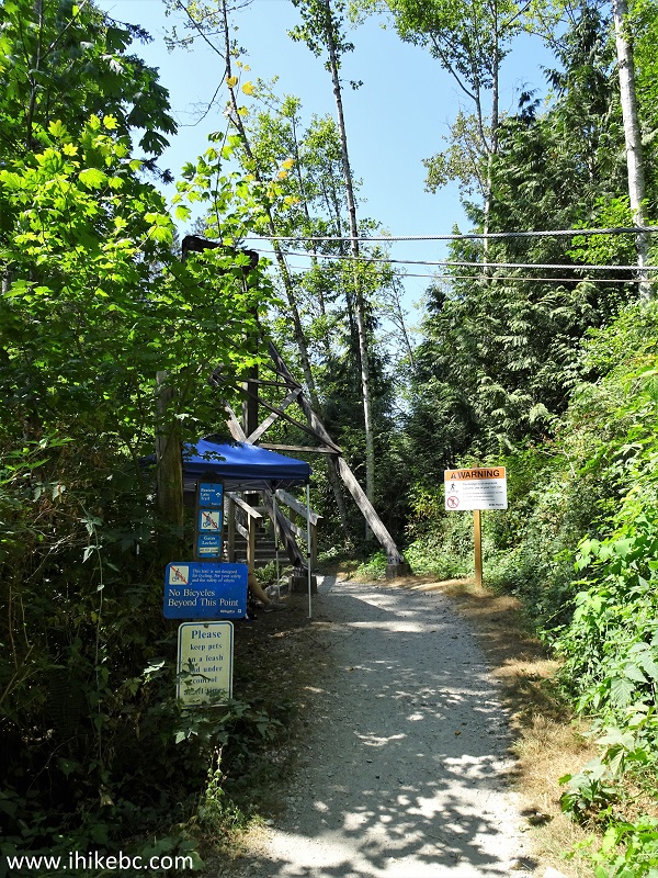 2. Buntzen Lake Loop starts on the East side of South Beach (far right, if facing the lake). The first parking lot is the closest to the beginning of the loop, but the last one is the closest to the end (though, all three lots are right next to each other). Here we are at the information board, with the trail beginning across the bridge on the right side (behind the board), and the gate leading back to the beach on the far left side of the photo below.