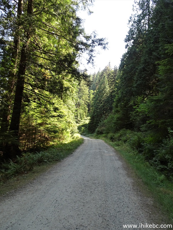 13-14. About 2.5 km from the viewpoint split (3.3 km from the trailhead), Buntzen Lake Trail comes out of the woods and joins Powerhouse Road.