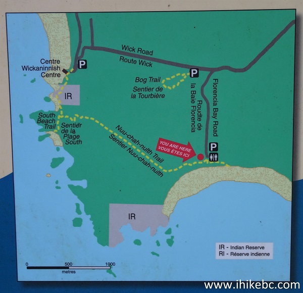 15-16. 50 meters from the parking area is Nuu-chah-nulth trailhead to Wickininnish Beach, should you wish to walk there (or from there), as opposed to driving. The photo of the map also shows the access road split, where a left turn leads to Florencia Bay Beach, and going straight leads to Wickininnish Beach.