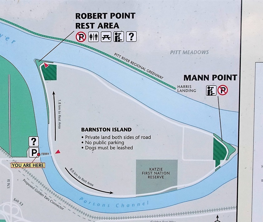 Of Note: No public parking on Barnston Island, no shoulders on circle road, backing up onto the ferry is required on Barnston Island Terminal. Vancouver, Coast & Mountains Backroad Mapbook (5th edition) Park Coordinates: Page 2 (Greater Vancouver) D3. Related Website: Barnston Island Regional Park - Metro Vancouver Official Website. Barnston Island is a fine little island located on Fraser River between Surrey and Pitt Meadows. A 2.5 minute-long free ferry ride connects Surrey's Port Kells area (northern end of 104 Avenue) with Barnston Island. A 10 km-long circle road goes around the island, and makes for a fine bicycle ride or a hike. Barnston Island is mostly farm land. As well, there is a Katzie First Nation reserve. Also, Barnston Island Regional Park has two areas on eastern and western ends of the island. In the east, 1.8 km to the left of the ferry terminal as you exit it, Point Roberts Rest Area features a washroom, picnic tables and trash cans. There is a decent, if not great, Fraser River view out there, 100 meters from the road in the picnic tables location. In the west, 4 km to the right of the ferry terminal as you exit it, a 300 meter-long path leads to Mann Point with a very impressive view of Golden Ears Bridge. There is no public parking on Barnston Island, and a rather inconvenient backing up onto the ferry is required at the Barnston Island Terminal. Thus, the best way to visit would be on a bicycle, after parking your vehicle at a free lot on the Surrey side of Fraser River. While the circle road has no shoulders, there is virtually no traffic, and it's a very serene location, with little noise, and rural and natural views all around. 1. Here is a Google map of Barnston Island. The ferry connection is seen on the left side, by Surrey Bend Regional Park we visited earlier in the day.