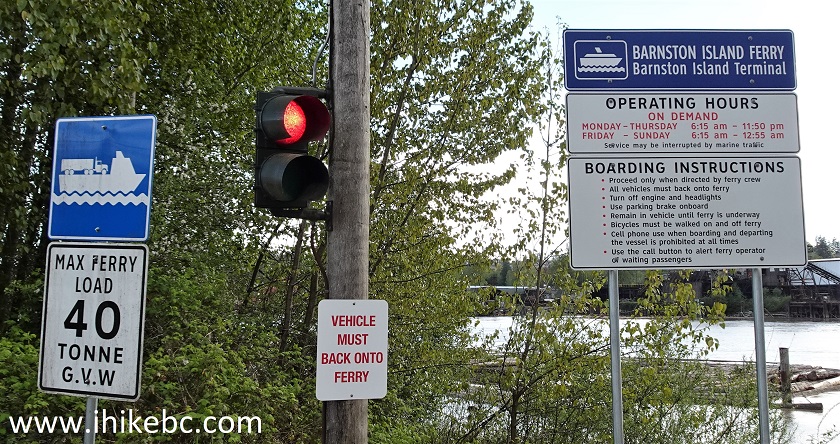 3. Barnston Island Ferry rules. Note that backing off from the ferry is required upon arrival to Barnston Island, and backing up onto the ferry is required on Barnston Island for the return trip to Surrey - Port Kells Terminal.