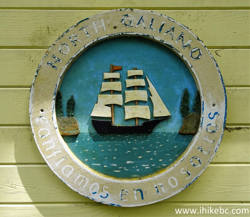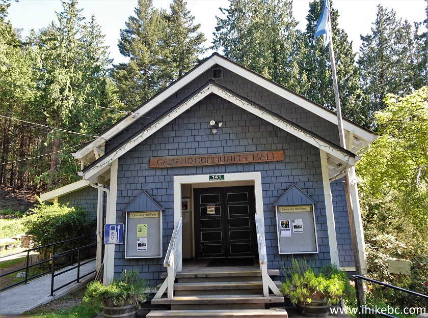 8-9. Galiano Community Hall is located at 141 Sturdies Bay Road. There is an EV charging station and a map of the island on a large board there. A pit toilet is located about 50 meters closer to the ferry terminal, just to the left of the Galiano Recycling Depot.