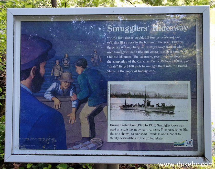 24. So, why is this called "Smuggler" Cove? For two reasons, as described in the information stand about 100 meters further down the main trail. In short, a man used to smuggle Chinese labourers from here to the United States, and, during the Prohibition, smugglers were using this cove to do their illegal business.