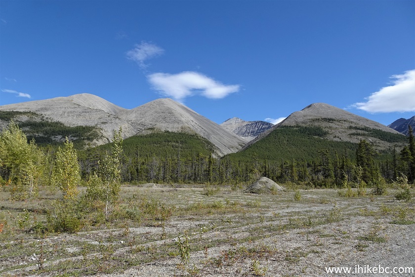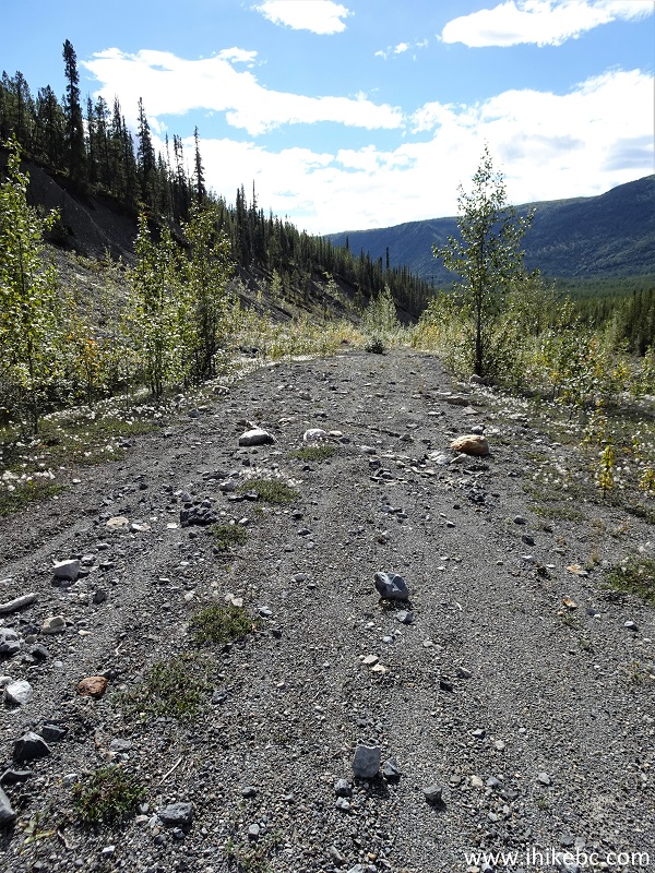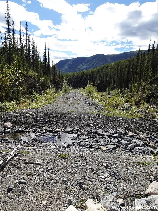 North of Fort Nelson and 9 km South of Muncho Lake. Liked: Several good mountain and creek views, an old busted shack, a small waterfall, fairly easy biking for most of the way. Of Note: Tiny vicious/merciless/aggressive/cannibalistic flies attack in hordes and bite off chunks of your flesh, several creek crossings are required - wading is the only option for at least one such crossing, numerous deep cross-ditches, Drogheda Lake may flood the road, impossible to bike all the way (2.5 km remaining if going North to South out of the total distance of about 9 km). Northern BC Backroad Mapbook (3rd edition) Approximate Trailhead Coordinates: Page 79 (Muncho Lake) E4. Peterson Canyon, which we biked North-South for 6.5 km (out of the total of approximately 9 km) until stopped by a missing bridge, certainly turned out to be a memorable visit. For starters, despite a very busy hiking season, we have not met a single mosquito on any of our trips. Which is amazing, really. However, Peterson Canyon more than made up for that with hundreds of exceptionally vicious cannibalistic flies. They are about 1/4 the size of a mosquito, but aggressively attack you in large numbers and bite off chunks of your flesh comparable in size to a mosquito bite. The skin then takes 5-7 days to heal and looks rather terrible in the meanwhile. Because the flies make very little noise and are very small, they can successfully attack you before you can even figure out what's going on, and then it's too late. Good thing we had a long-sleeved shirt, carried rain pants, and had a mosquito head net. Otherwise, things could have been much worse. As is, about 50 bites later, we escaped relatively unscathed. As for the Peterson Canyon itself, the trail is more like a forest service road, hard packed gravel, with lots of loose stones in some stretches, and is an old part of Alaska Highway. There are two ends of this road, both starting off the current Alaska Highway, about 225/236 km North of Fort Nelson and 9/20 km South of Muncho Lake (which has a lodge with an eye-wateringly expensive gas station - about 50 cents per litre more dear than in the Lower Mainland - fuel at Toad River 50 km to the South to save 20 cents or so per litre, if you can. The gas station on the South end of Muncho Lake had broken pumps, so, maybe, it is not as expensive as the lodge). Aside from the flesh-hungry flies, which may or may not be present during your visit, the main obstacles for this trail are numerous deep cross-ditches, including several containing flowing water. As we biked at the end of the season, the only obstacle requiring wading was the first creek, about 480 meters from the start. We got lazy and did not want to go back to get flip-flops. So, took off boots and socks, took them into the left hand, started crossing the creek, and dropped one boot into the water. Tried to pick it up, but the current was just strong enough to move the boot out of our reach, which then floated around the corner and out of sight. So, got on the bike, rode back to our vehicle, grabbed a spare pair of hiking boots, got back to the creek, started going downstream, and, thank God, found our boot stuck in some branches about 200 meters later. We then continued with our biking trip, discovered a busted shack and remnants of a burned down house, crossed many cross ditches, crossed a bridgeless Peterson Creek, and were stopped by a missing bridge at about the 6.5 km mark. Hikers might find a way to cross to the other side and proceed for the next 2.5 km or so to the South end of the trail, but the canyon walls were too steep to drag the bike up, so we headed back. *All trail distances are based on a GPS odometer and are approximate.