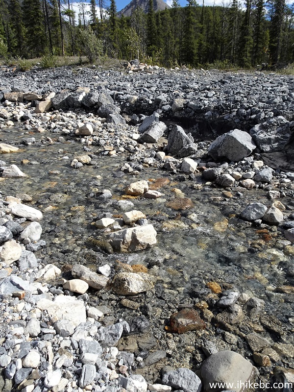 34. At 3.56 km, we arrived to a "bridge out" point of the road. It even showed that on our GPS trail ribbon. Peterson Creek flows here, and it obviously becomes very large during the spring runoff, moving substantial amounts of stones around, which makes it impossible to bike.