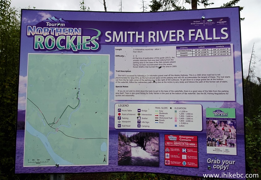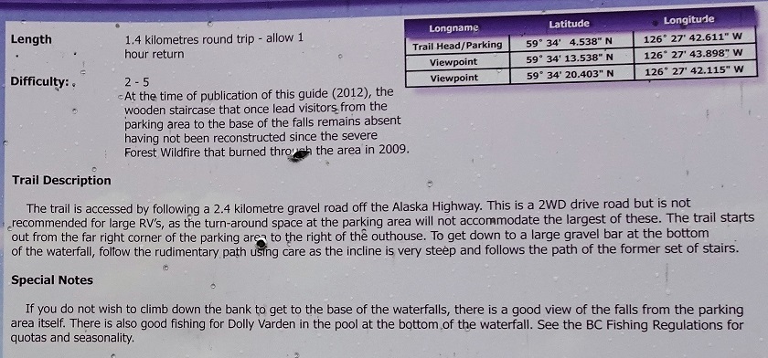 Of Note: 2.3 km-long access road is filled with potholes (regular clearance vehicles ok), parking lot may not be large enough for vehicles bigger than a full size pickup to turn around, several short steep stretches on the trail, hiking poles and boots are recommended. Northern BC Backroad Mapbook (3rd edition) Coordinates: Page 89 (Coal River) D6. Smith River Falls is a fine waterfall, more wide than tall, with an easy access off BC Highway 97 (Alaska Highway) 30 km North of Liard River and 345 km North of Fort Nelson. A gravel road full of potholes leads to a rather small parking lot 2.4 km from the highway. Any vehicle not larger than a full size pickup truck and with regular clearance should be able to get to the parking area and turn around. The trail to Smith River Falls is rather steep, but has a very neat staircase, which takes care of much of that steepness. The trail is very short too, all of 300 meters one way, but, interestingly enough, the info board by the trailhead states that the round distance is 1.4 km, or 700 meters one way. Not sure what might have caused such a discrepancy. Also, the toilet is still there, but it's boarded up pretty good. Finally, if you don't feel like hiking to the waterfall, a decent view of Smith River Falls can be had right from the parking lot. *All trail distances are based on a GPS odometer and are approximate. 1. Here are Google Maps directions from Liard River, BC to Smith River Falls access road turnoff, located off BC Highway 97 (Alaska Hwy) about 30 km North of Liard River.