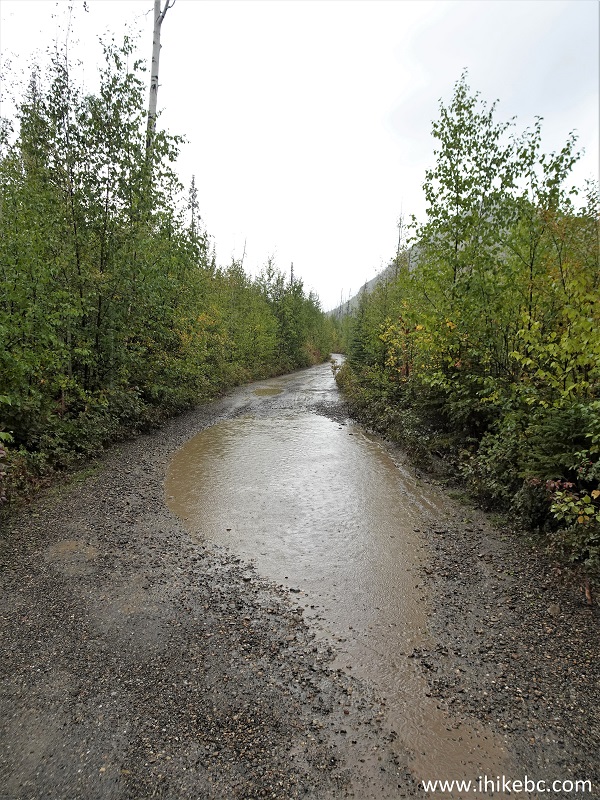 6. And here is Smith River Falls parking lot, 2.4 km from Highway 97. Coordinates: N 59°34.074’ W 126°27.721’. Elevation: 470 meters. Extra large vehicles may find turning around rather complicated, especially if other vehicles would already be parked here.