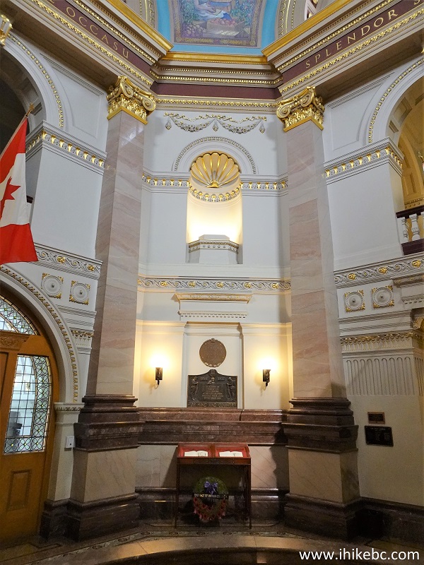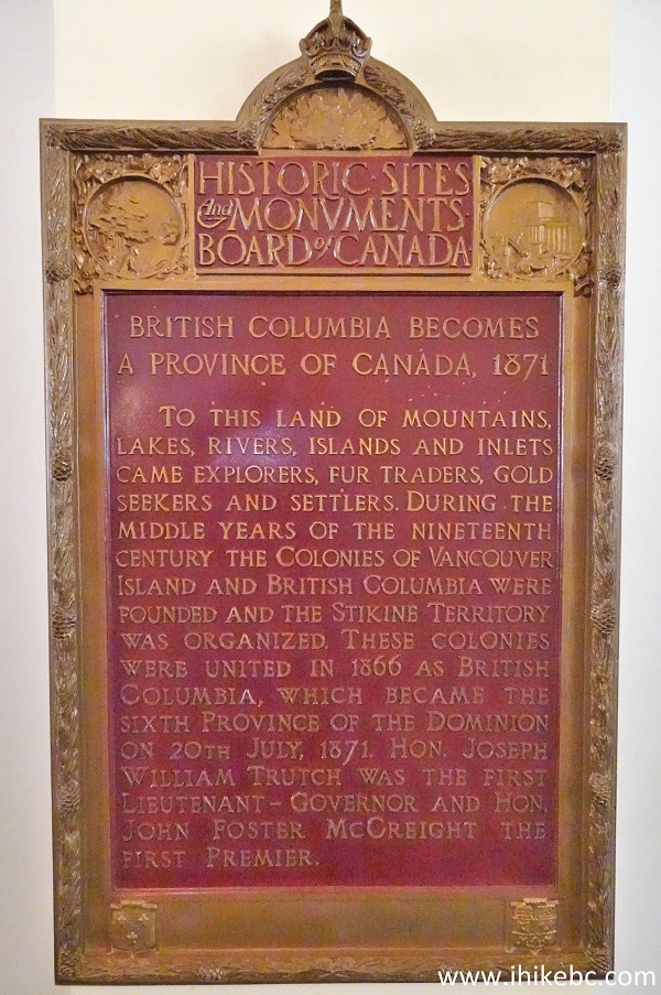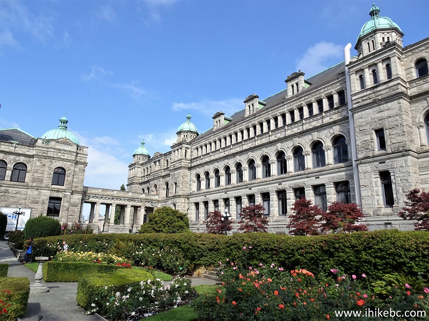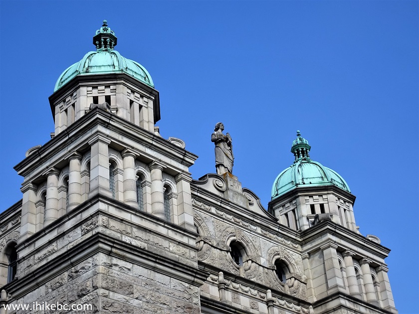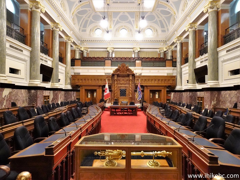 Downtown Victoria, British Columbia, Canada. Liked: Buildings exterior (architectural design), 2nd floor highly ornamented rotunda, legislative chamber, ornamented windows and doors, photos of politicians past and present, free admission. The main grounds in front of the complex (across from the Victoria harbour) is very fine too. Of Note: The place is very popular. Parking at the nearby lots could be difficult in busy season. Only public tours (no self-guided tours) on weekends. Appropriate attire is required (no political messages allowed either). Vancouver Island, Victoria & Gulf Islands Backroad Mapbook (9th edition) Coordinates: Page 5 (Victoria) B4. Related Website: BC Parliament Buildings Public Tours. Follow @ihikebc TweetBC Parliament Buildings is a set of buildings where the business of governing the province of British Columbia takes place. The people we elect to represent us, called MLAs (Members of Legislative Assembly), come to Victoria and spend much time in this place making decisions affecting our lives in ways big and small. Be careful who you send down there! The public is welcome to observe the MLAs in the legislative chamber from a balcony when the BC Parliament is in session. There are also daily self-guided and tour guide tours available inside the main building, which has a substantial visual appeal and numerous historical photos. Stained glass windows and ornamented interior doors are quite interesting to see. The second floor rotunda is a masterpiece. The legislative chamber also looks very fine, definitely worthy of our splendid province! As well, a walk around the entire Parliament Buildings complex is a worthwhile endeavour due to the very fine architectural design and numerous statues on top and the sides of the exterior of the buildings. If you are driving, there are several pay parking lots nearby, and they get busy during busy season. Also, if your clothing or whatever you carry features anything resembling a political message, you would be turned around at the security checkpoint.