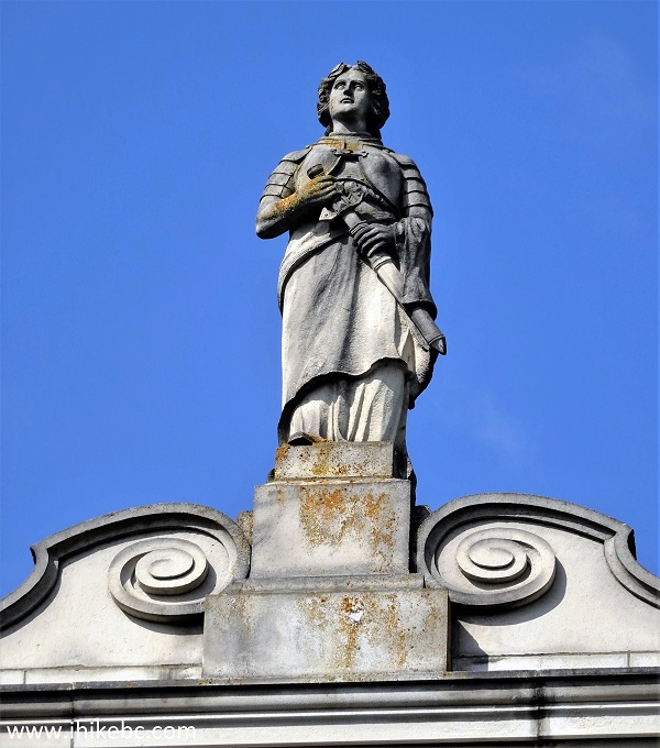 48. There are quite a few statues hanging out inside the exterior walls and on top of the roofs.