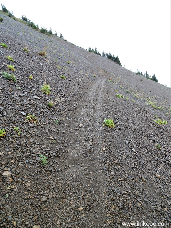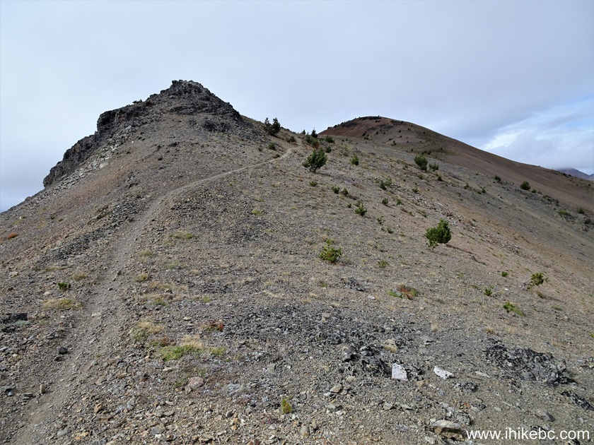 West of Lillooet. Liked: Numerous great mountain and valley views, shade in the forest on the access road, not terribly difficult trails, no bugs. Vancouver, Coast & Mountains Backroad Mapbook (2019 edition) Park Coordinates : Page 51 (Gold Bridge) B1. Related Website: South Chilcotin Mountains Provincial Park - BC Parks Official Website. Follow @ihikebc TweetSouth Chilcotin Mountains Provincial Park is a huge remote park located near the settlement of Gold Bridge, closer to the end of BC Highway 40, which starts 90+ km earlier in Lillooet. There are numerous long trails in the park, and we hiked a small portion of those in the south-eastern corner. To see much more than that one would have to prepare to spend at least one night camping, while we did a day trip, which consisted of hiking a part of High Trail, then Camel Pass Trail, and, finally, Ridge-O-Rama trail to complete the loop. There were panoramic mountain views everywhere, looking impressive even despite a cloudy day. With the sun out, it would be even more impressive. What was surprising were several motorcycle tracks along our entire route, even where it was rather dangerous. We later learned that this area is popular with mountain bikers, but those tracks were certainly from a motorcycle. So, watch out while hiking in this mountainous area, lest you be run over by a motorcycle! Please, note that only hikers, horse riders, and bicycle riders are allowed in the park. There are several access point to South Chilcotin Mountains Provincial Park, and we used the one off Tyaughton Lake Road, which begins off BC Highway 40 about 12 kilometers East of Gold Bridge. There are no signs leading to the park, and several not-so-obvious turns, so check out our photo directions, as well as a video of the drive from Highway 40 to Cinnabar Mining Road, which leads to High Trail trailhead. * All trail distances are based on a GPS odometer and are approximate. 60. Here we are at the 1.06 km mark of Ridge-O-Rama Trail. Completing the loop towards Cinnabar Mining Road.