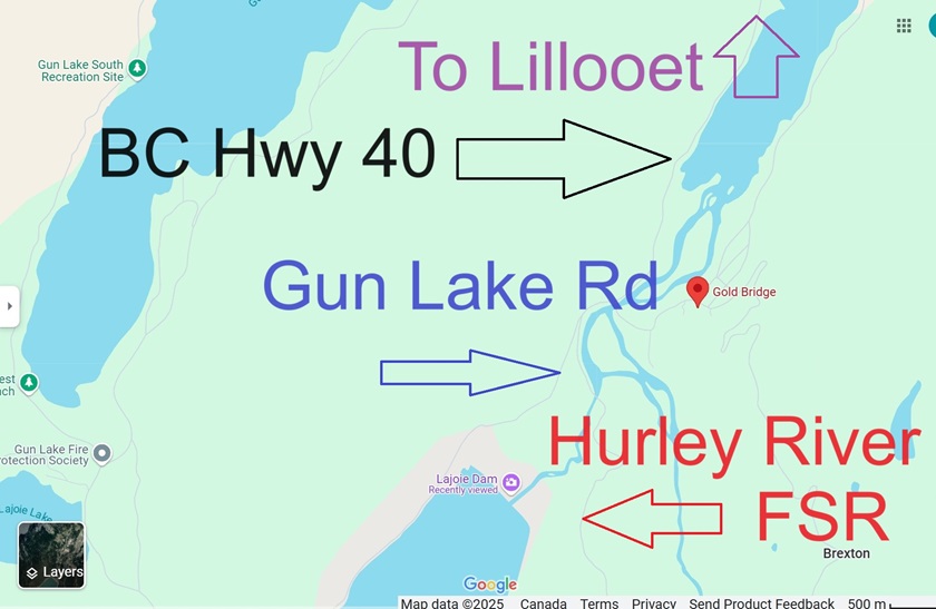Google Map of Gun Lake Road and Hurley River FSR near Gold Bridge BC